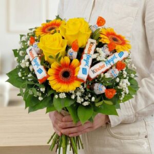 Ein Blumenstrauß für Leckermäulchen. Zwischen drei Rosen, drei Germini und saisonalem Beiwerk sind leckere süße Überraschungen versteckt. Gern wird dieser Strauß zum Geburtstag, zur Einschulung oder als Überraschung einfach mal so verschickt. – ✿ 3 Germini und 2 Rosen ✿ Beiwerk und Bindegrün ✿ Maoam, Gummibärchen, Lolli