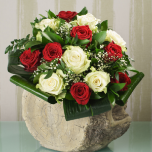 zweifarbige Rosenblüte in Geschenkbox